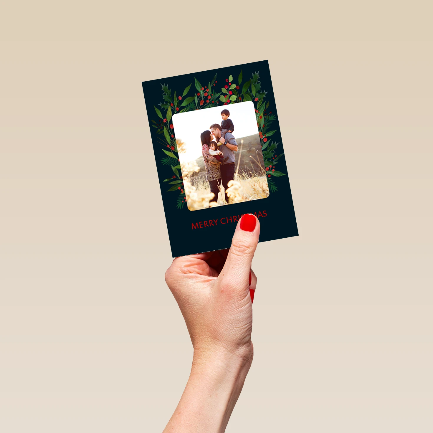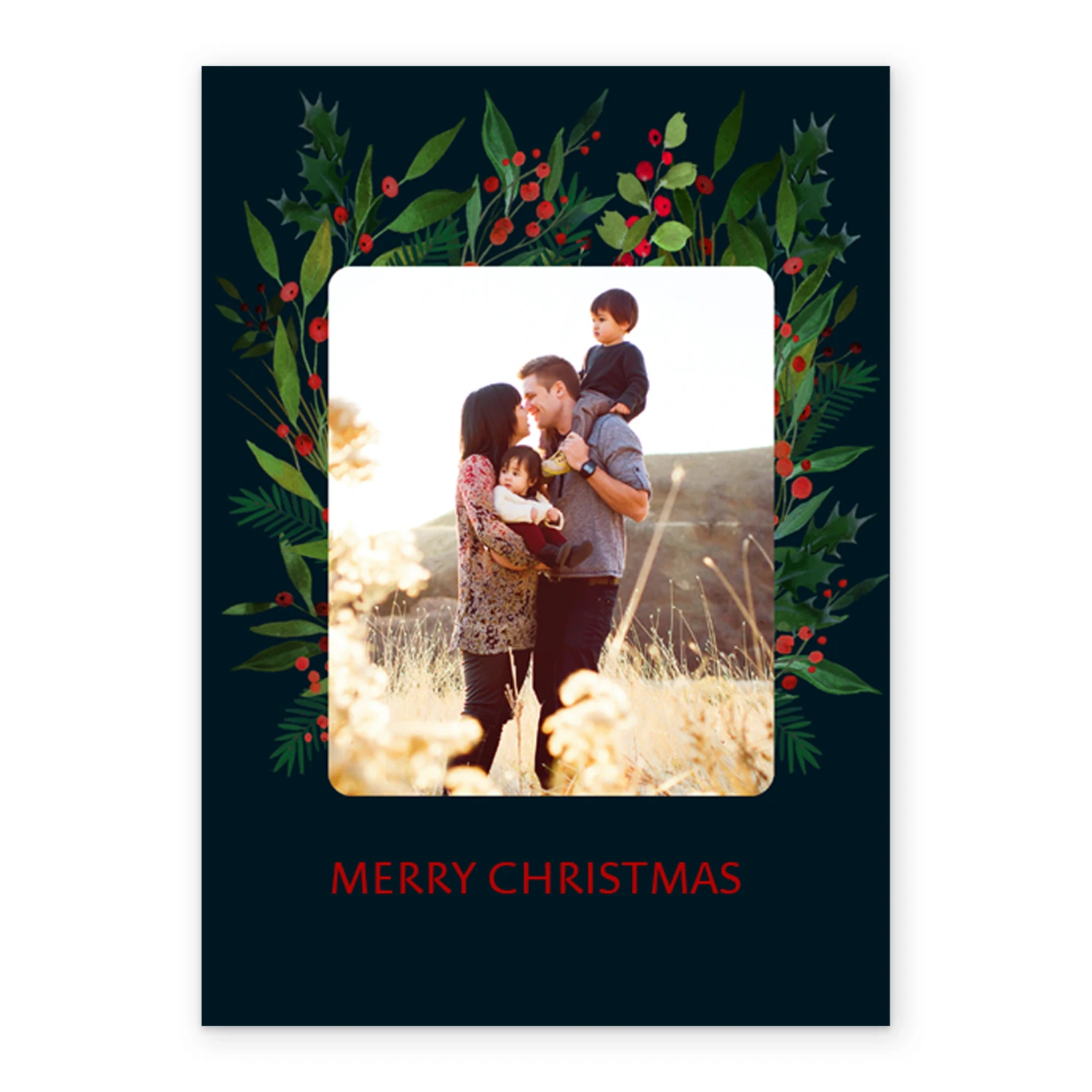 Show them you care with a personalised winter wreath photo card from Hallmark. Our Christmas cards are printed on premium quality, FSC®-certified card & delivered nationwide. This card is available as standard 12cm by 16.7cm and large 15.5cm by 21.6cm.