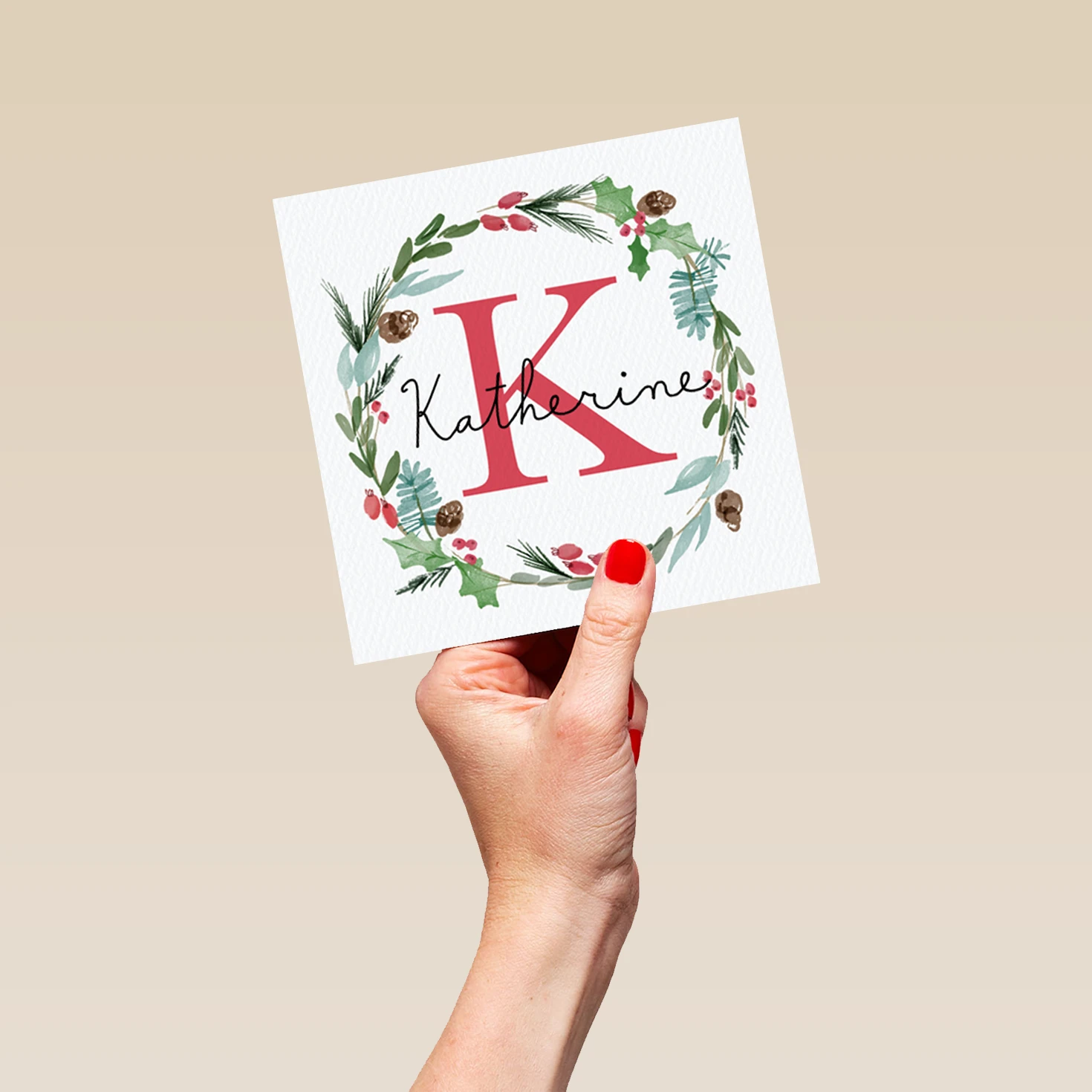 Pod Personalised Wreath Monogram Letter K Christmas Card