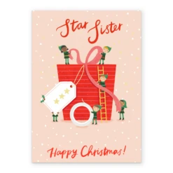 Pod Personalised Cute Elves & Gift Christmas Card For Sister